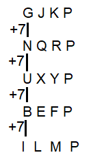GJKP/NPRP/UXYF/BELP/ICMP(first letter is increasing by 7 but second letter not