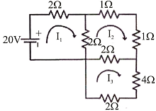 20−2I1−2I1+2I2=04I1−2I2=20(1)(2+2+1+1)I2−2I1−2I3=06I2−2I1−2I3=0(2)(2+2+4)I3−2I2=08I3=2I2(3)I3=4I2