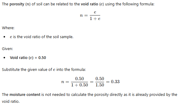 Find the porosity of a soil sample having void ration of 0.50 and a moisture content of 30% will be -