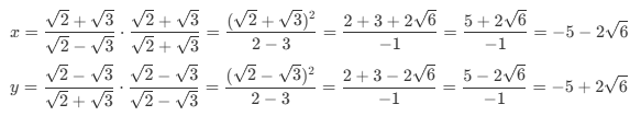 Correct option is BGiven:x=2+32−3,y=2−32+3x = \dfrac{\sqrt{2} + \sqrt{3}}{\sqrt{2} - \sqrt{3}}, \quad y = \dfrac{\sqrt{2} - \sqrt{3}}{\sqrt{2} + \sqrt{3}}x=2−32+3,y=2+32−3Formula Used:x2−y2=(x−y)(x+y)x^2 - y^2 = (x - y)(x + y)x2−y2=(x−y)(x+y)(x+y)2=x2+y2+2xy(x + y)^2 = x^2 + y^2 + 2xy(x+y)2=x2+y2+2xySolution:Now,(x+y)2=((−5−26)+(−5+26))2=(−10)2=100(x + y)^2 =( (-5 - 2\sqrt{6}) + (-5 + 2\sqrt{6}))^2 = (-10)^2 = 100(x+y)2=((−5−26)+(−5+26))2=(−10)2=100