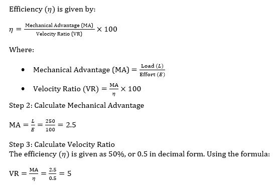 Find the velocity ratio of a pulley system if it has an efficiency of 50%. It lifts a load of 250 N on applying an effort of 100 N.
