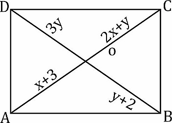 OA = x + 3, OB = y + 2, OC = 2x + y, OD = 3y.