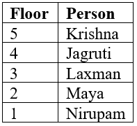 Five employees of the same company, Jagruti, Krishna, Laxman, Maya and Nirupam, live on five different floors of the same building. The lowermost floor in the building is numbered 1, the floor above it number 2, and so on till the topmost floor is numbered 5. Krishna and Nirupam live on the topmost and bottommost floors, respectively. Jagruti lives on the floor immediately above Laxman. Maya lives on the floor immediately above Nirupam.