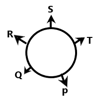 · Five friends P, Q, R, S, and T are sitting around a circular table facing away from the center.
