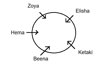 Five girls, Beena, Elisa, Hema, Ketaki and Zoya, are sitting around a circular table facing the centre of the table. Beena is sitting to the immediate