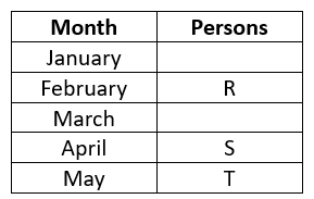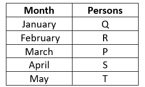 Five persons, P, Q, R, S and I travelled in different months of the same year viz. January, February, March, April and May. R travelled in February. Only one person travelled between R and S. T travelled in a month after S.