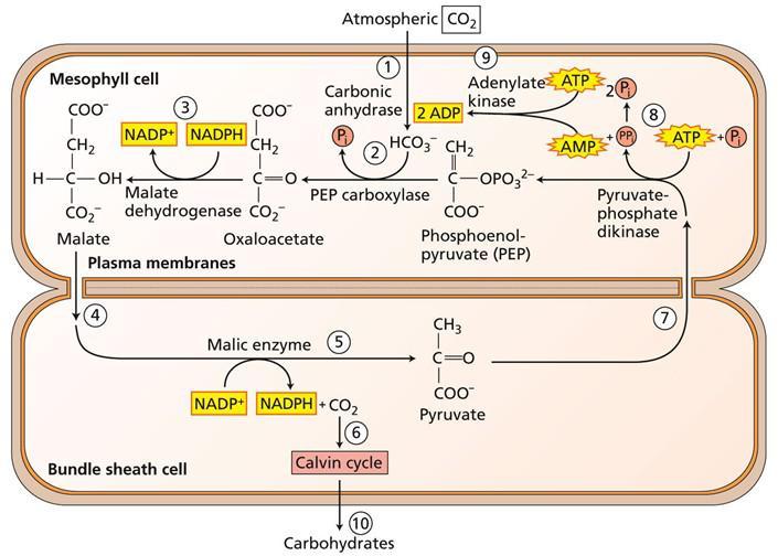 - This is incorrect. While aspartate can be synthesized from oxaloacetate, it is typically not the key molecule involved in the C4 pathway in mesophyll cells. The focus is on malate and pyruvate in this context, not aspartate.