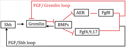 FGFs and Gremlin Regulation: FGFs, which are critical for limb outgrowth, function by inhibiting Gremlin, a BMP antagonist. When Gremlin is inhibited, it allows BMPs to activate their signaling pathways, which is important for the regulation of the AER and its associated signaling processes.