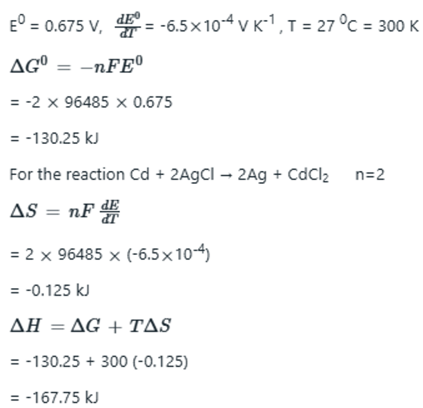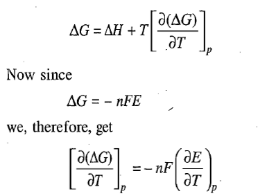 Correct option is AThe free energy change accompanying a cell reaction can be obtained from the emf of the cell through the relationThe changes in enthalpy and entropy of the cell reaction can also be determined if the temperature dependence of the emf of the cell is available. For this, we make use of the Gibbs-Helmholtz equation: