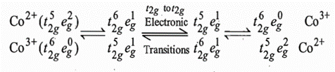 Since Co(II) and Co(III) complexes are high spin and low spin respectively, no simple addition or removal of an electron can convert these configurations into one another. Therefore, it is necessary to excite the oxidation states before the reaction can occur as shown below: