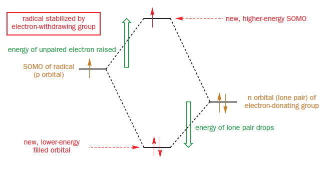 Groups like C=O and CN are electron-withdrawing because they have a low-lying empty п* orbital. By overlapping with the (usually p) orbital containing the radical (the SOMO), two new molecular orbitals are generated. One electron (the one in the old SOMO) is available to fill the two new orbitals. It enters the new SOMO, which is of lower energy than the old one, and the radical experiences stabilization because this electron drops in energy.