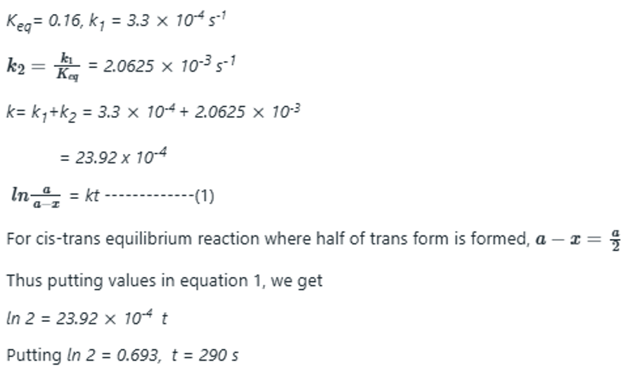 the equilibrium constant is 0.16 and k1 is 3.3×10-4s-1.The experiment is started with pure cis from. The time taken for half the equilibrium amount of trans isomer to be formed is about