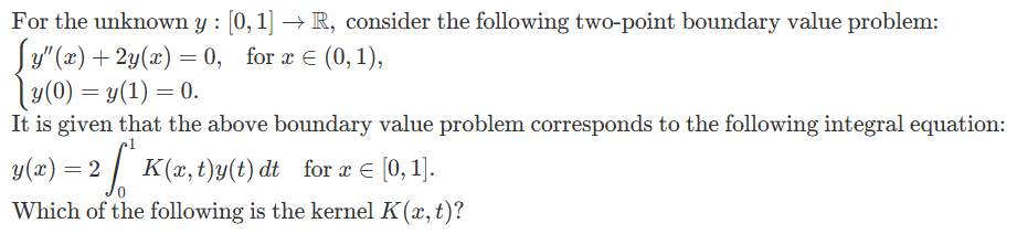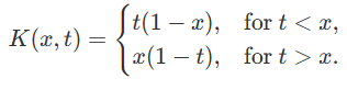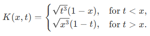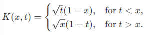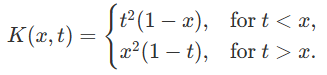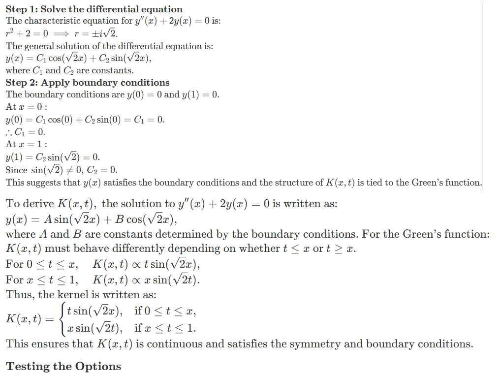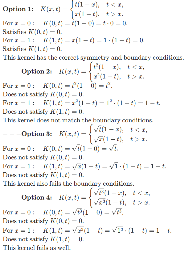 To derive K(x,t), the solution to y′′(x)+2y(x)=0 is written as:y(x)=Asin(2x)+Bcos(2x),where A and B are constants determined by the boundary conditions. For the Green’s function:K(x,t) must behave differently depending on whether t≤x or t≥x.For 0≤t≤x,K(x,t)∝tsin(2x),For x≤t≤1,K(x,t)∝xsin(2t).Thus, the kernel is written as:K(x,t)={tsin(2x),xsin(2t),if 0≤t≤x,if x≤t≤1.This ensures that K(x,t) is continuous and satisfies the symmetry and boundary conditions.
