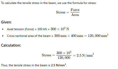For working stress method, if a rectangular beam 300×400 carries an axial tension of 300 kN . Calculate the value of tensile stress in it.