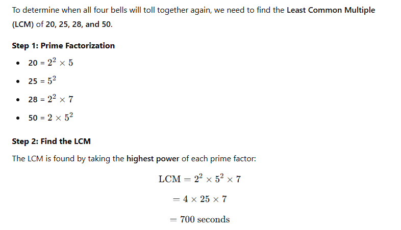 Four bells begin tolling at the same time and continue to toll at intervals of 20, 25, 28 and 50 seconds respectively. Find the smallest integral number of seconds after which all the bells toll together again.