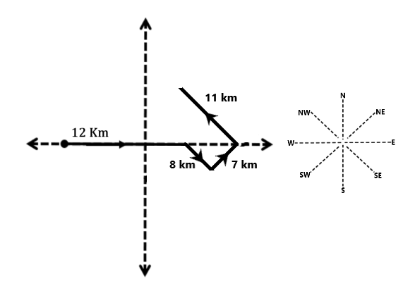 From here he turned left and travelled 7 km and finally turning left he covered 11 km. If he was going north-west at last.