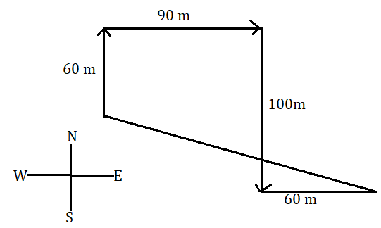 He again turns and walks 40 metres in south-east and finally he turns again towards his house.