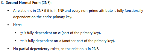 Statement B: The relation being in 2NF depends on no partial dependency and being in 1NF, which is true here.