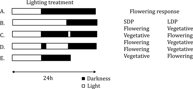 Long-Day Plants (LDP): These plants require long light periods (usually more than 12 hours) and short dark periods for flowering. Experiment E correctly shows that LDP flowers under long light exposure.