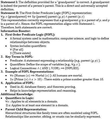 Given below are two statements: Statement I: “Grandparent is a parent of one’s parent.” Statement II: First Order Predicate Logic (FOPL)