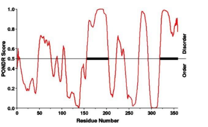 PONDR Score: The plot shows multiple peaks and valleys in the protein sequence, which suggests that the protein contains multiple regions of order and disorder.