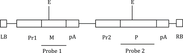 This is correct because Probe 1 is near the LB border and can hybridize to two fragments after digestion with restriction enzyme E. One band corresponds to the fragment between the LB and the nearest E site within the T-DNA, and the other band corresponds to the fragment between the LB and an E site in the genomic DNA flanking the insertion. This results in two hybridization bands, confirming (a) as true.(c) For true single copy events, one hybridization band would be of the same length for each of the two probes used for hybridization: