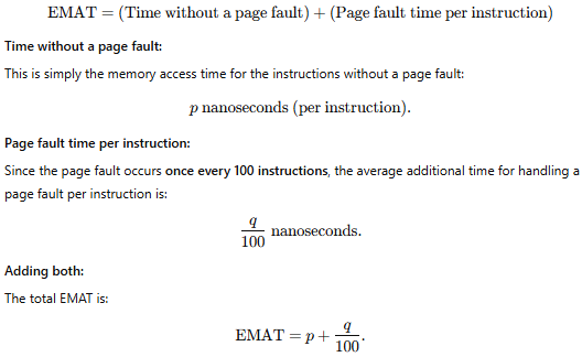 Effective Memory Access Time (EMAT): EMAT measures the average time needed to access memory, including the overhead caused by page faults.