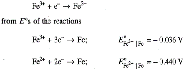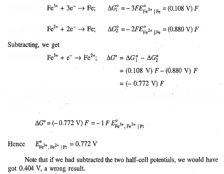 A given reaction may be obtained from other reactions by carrying out the simple mathematical manipulations such as addition, subtraction, multiplication by a number and so on. Since G° is a state function, the ΔG° of the given reaction may be obtained by carrying out the corresponding manipulations on ΔG°s values of the reactions. This procedure, however, cannot be adopted while calculating E° of a half-cell reaction from the values of other half-cell reactions. Nevertheless, we can determine the potential of a half-cell reaction from the potentials of other half-cell reactions via the associated ΔG° values. First of all, we write