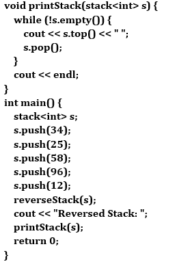 Original Stack: (not printed), Reversed Stack: 34 25 58 96 12. In the given code snippet, there is no line to print the original stack before reversing it. Therefore, the "Original Stack" is not printed. The stack is reversed by reverseStack(s);, and the reversed order is printed by printStack(s);, which outputs