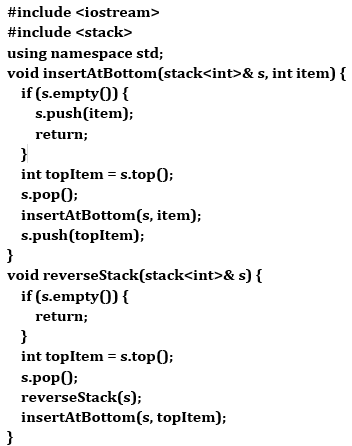 · This function pops elements from the stack until it is empty, then reinserts them at the bottom using insertAtBottom, effectively reversing the stack.