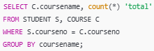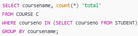 Incorrect: This query fails because it does not count the number of students correctly—it only counts the number of matching coursename entries in COURSE.