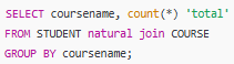 Objective: To compute the total number of students enrolled in each course (count (*)) grouped by coursename.