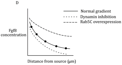 Rab5C overexpression enhances endocytosis, increasing removal of Fgf8 from the extracellular space, leading to a steeper and lower concentration gradient.