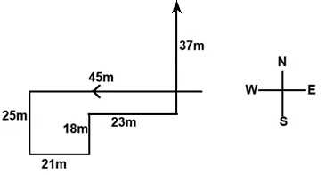 Harsh walks 45 m towards the west and turns to left and walls 25 m. He then turns to the left and walks 21 m. Again, he turns left and walks 18 m. Aft