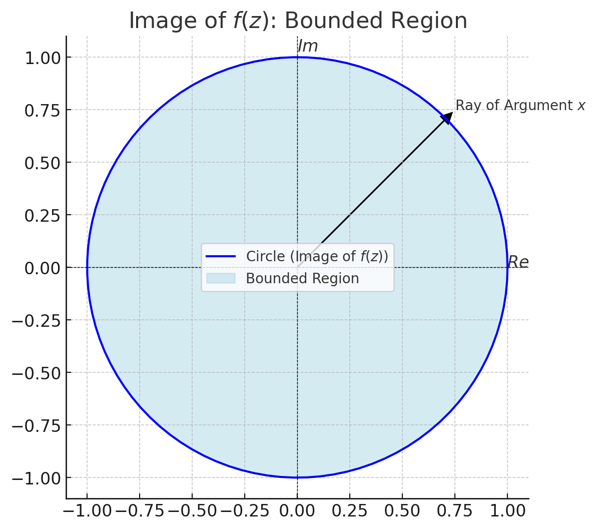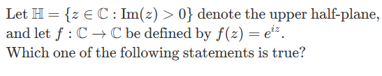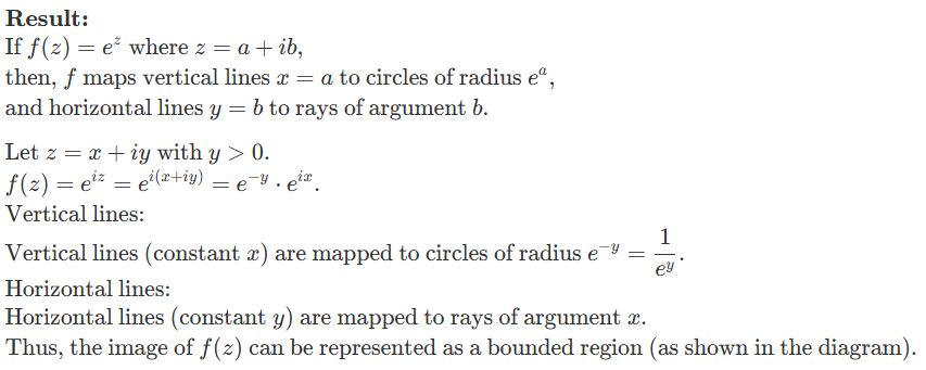 Correct option is CHere is a representation of the diagram. The bounded region is shown as a circle, with vertical lines mapped to circles of radius 1ey\frac{1}{e^y}ey1 e−ye^{-y} and horizontal lines mapped to rays of argument xxx. The arrow indicates a ray corresponding to the argument of a horizontal line.