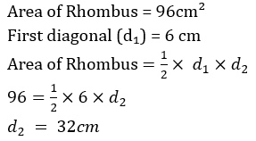 How much does the 2nd diagonal of a rhombus measure if the area is 96 sq cm and the 1st diagonal measures 6 cm?