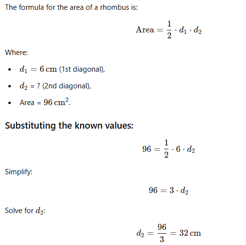 How much does the 2nd diagonal of a rhombus measure if the area is 96 sq cm and the 1st diagonal measures 6 cm?
