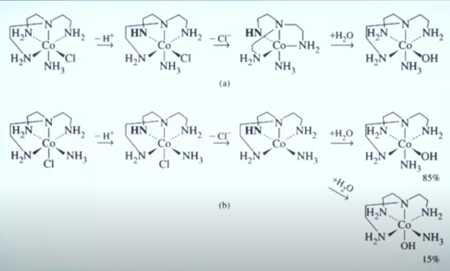 Reactions with [Co(tren)(NH3)CI]2+isomers show that the nitrogen atom trans to leaving group is most likely to be deprotonated in the conjugate base mechanism. The dominant kinetic product in both reactions is hypothesized to proceed by a trigonal-bipyramidal intermediate or transition state with the amido ligand in the trigonal plane. The reaction in Figure a has a much lower barrier to trigonal-bipyramidal geometry (with only slightly widening of two N-Co-N than does the Figure b reaction, which requires more dramatic rearrangement square-pyramidal structure. The activation energy associated with hydrolysis of the square pyramidal intermediate in Figure b, where the hydroxo ligand would engage an oxygen orthogonal to the amido nitrogen, is sufficiently high that the (slow) rearrangement trigonal-bipyramidal structure, followed by hydrolysis is still the faster pathway.
