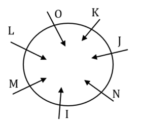 I, J, K, L, M, N and O are sitting along a circle facing at the centre and are playing cards. M is the immediate neighbour of I and L. J is second to