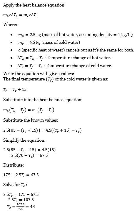 If 2.5 I of hot water at 85°C is mixed with 4.5 I of cold water then the temperature of the cold water rises by 15°C when equilibrium is reached. Find