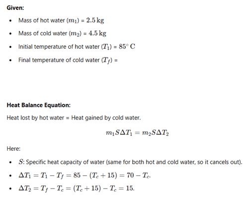 If 2.51 of hot water at 85°C is mixed with 4.51 of cold water then the temperature of the cold water rises by 15°C when equilibrium is reached. Find the initial temperature (in °C) of the water assuming no heat is lost.