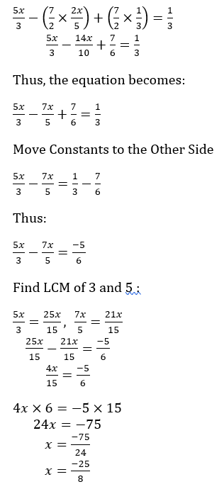 If 5x/3 - 7/2 (2x/5 - 1/3) = 1/3, then the value of x is___________.