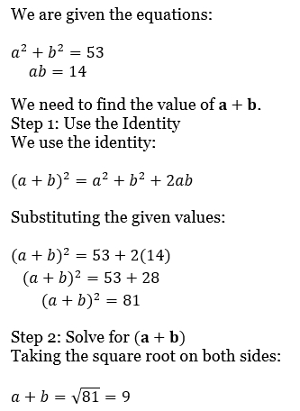 If a²+b² = 53 and ab = 14, then find the value of a + b.