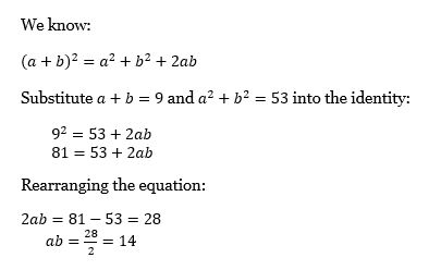 If a + b = 9 and a² + b² = 53, then find the value of ab.