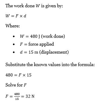 If a box of mass 25 kg is pushed 15 m by a force of ‘F’ N and work done in the process is 480 J. Find F: