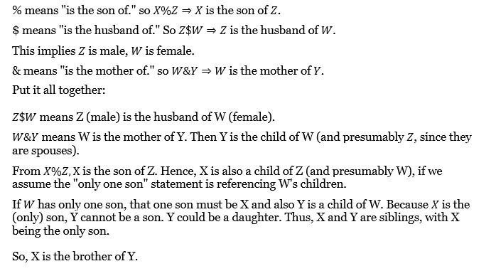 If C $ D means C is the husband of D, C & D means C is the mother of D and C % D means C is the son of D, then What does X % Z $ W & Y mean if W has only one son?