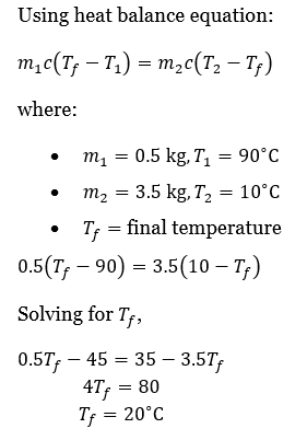 If half a litre of hot water at 90°C is mixed with three and a half litres of cold water at 10° C, find the final equilibrium temperature (in °C) if no heat is lost.