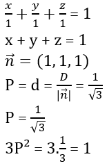 If p is the perpendicular distance from origin to the plane passing through (1, 0, 0), (0, 1, 0) and (0, 0, 1), then what is 3p2 equal to?