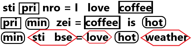 If 'sti pri nro' means 'I love coffee', 'pri min zei' means 'Coffee is hot' and 'min sti bse' means 'Love hot weather', which code stands for 'Love weather'?
