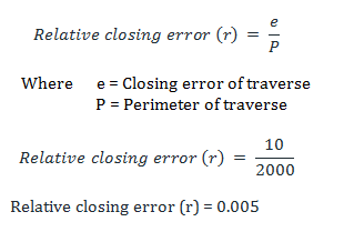 Relative closing error (r) is defined as the ratio of the closing error of the traverse to the perimeter of the traverse.